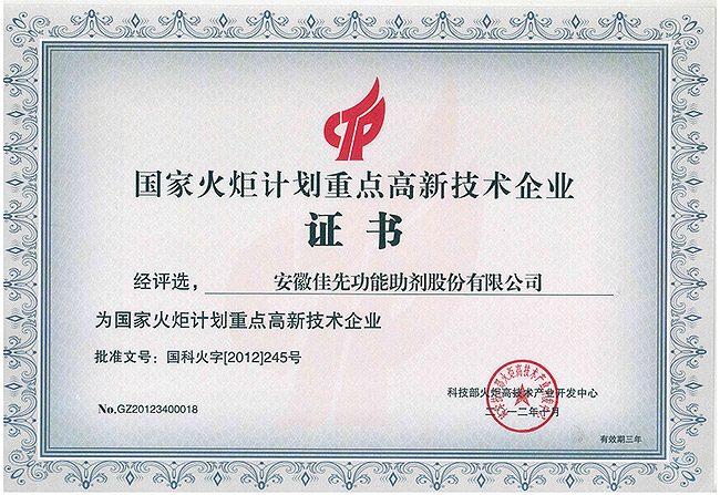 佳先股份國家火炬計劃重點高新技術(shù)企業(yè)