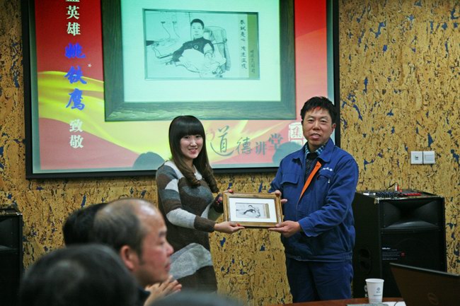 在學(xué)模范環(huán)節(jié),我們的“身邊人”—來自公司系統(tǒng)中環(huán)水務(wù)有限公司的蚌埠助人為樂好人姚鐵鷹,講述他十年義務(wù)獻血2萬5千毫升的感人事跡。在活動現(xiàn)場,公司向姚鐵鷹贈送了由志愿者們制作的記錄他獻血義舉時的肖像,并向全體職工倡議:向蚌埠好人姚鐵鷹學(xué)習,將志愿服務(wù)化作自覺行為和生活方式。