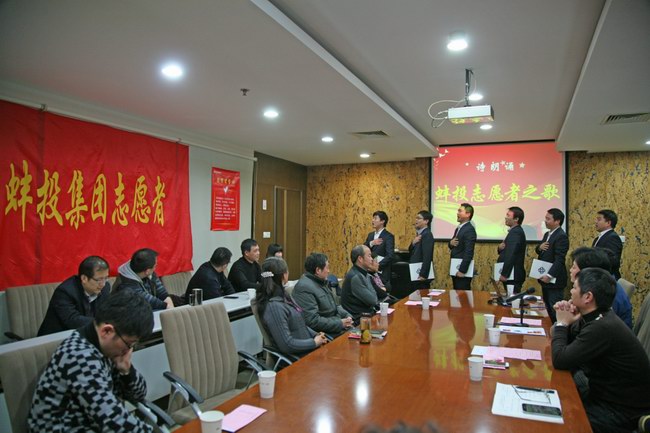 在談感悟環(huán)節(jié),主持人介紹了近期公司志愿者注冊登記工作開展情況,宣布成立蚌投集團志愿服務(wù)隊。在本環(huán)節(jié)中, 6名志愿者現(xiàn)場為大家?guī)砹嗽姼枥收b——《蚌投志愿者之歌》并莊嚴宣誓。
