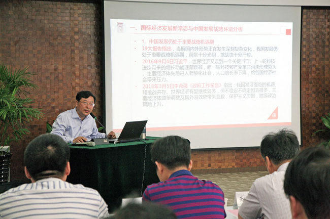 上午,陳教授做了“十九大后中國經(jīng)濟發(fā)展趨勢分析”的專題報告,結(jié)合十九大后國內(nèi)外經(jīng)濟發(fā)展新形勢,在對國際經(jīng)濟發(fā)展新常態(tài)與中國發(fā)展戰(zhàn)略環(huán)境內(nèi)在聯(lián)系研究基礎(chǔ)上,深入分析了十九大后國內(nèi)經(jīng)濟發(fā)展走勢與改革走向。下午,陳教授做了“國資國企改革的難點熱點分析”的專題報告,結(jié)合近幾年國資國企改革政策及國內(nèi)國企整體發(fā)展現(xiàn)狀,提出學(xué)習(xí)貫徹十九大精神,進一步加快國資國企改革的必要性,在此基礎(chǔ)上,深入介紹了深化國資國企改革的具體內(nèi)容與發(fā)展趨勢。
