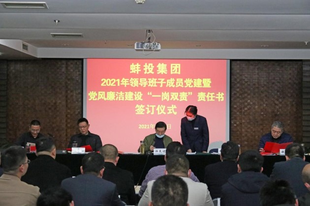 會議總結(jié)了蚌投集團2020年度工作完成情況,部署了2021年度重點工作。中創(chuàng)發(fā)展、能源集團、擔保集團、蚌發(fā)公司、項目管理5家子公司負責人分別進行2020年度述職述責述廉。會議部署了2021年度集團黨建暨黨風廉潔建設工作,啟動了新一輪深化“三個以案”警示教育。汪支邊同志與集團黨委班子成員簽訂2021年度“一崗雙責”責任書,并與子公司代表簽訂2021年度黨建暨黨風廉潔建設、經(jīng)營目標、安全生產(chǎn)、環(huán)境保護、平安建設(綜治工作)目標責任書。