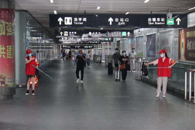 從落客平臺(tái)到公交車站再到中央廣場(chǎng),志愿者們辛苦撿拾每一個(gè)煙頭,耐心解答每一次問(wèn)詢,勸阻亂扔垃圾、隨地吐痰等不文明行為,為創(chuàng)城工作做出了自己的貢獻(xiàn)。