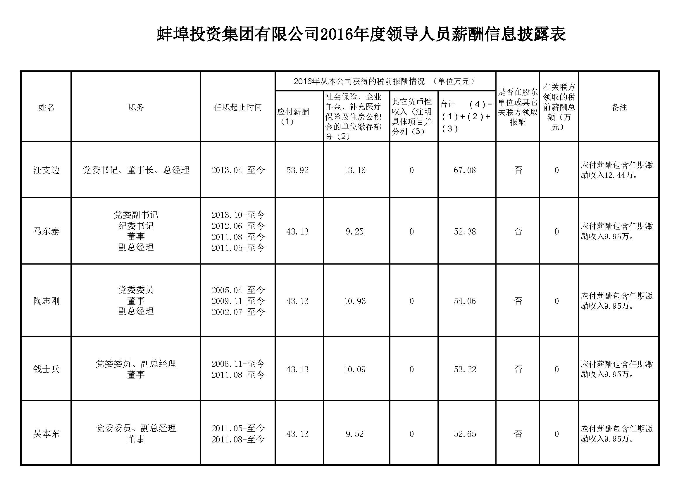 蚌埠投資集團(tuán)有限公司2016年度領(lǐng)導(dǎo)人員薪酬信息披露