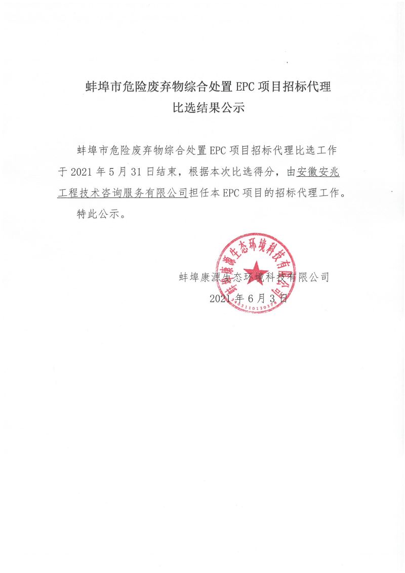 蚌埠市危險廢棄物綜合處置EPC項目招標(biāo)代理比選結(jié)果公示